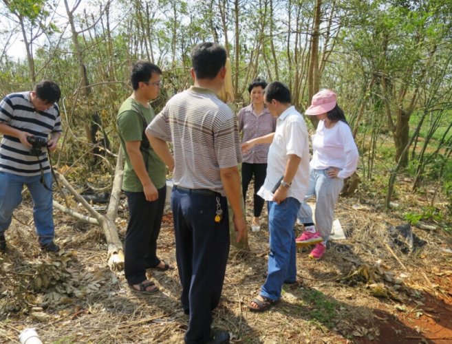 此外,在灾情调查的基础上,7月23日罗萍副研究员带领团队成员3人与体系首席办安排的救灾团队安锋副研究、段翠芳副研究员等3人共同到受灾最重的南华农场、五一农场和友好农场进行灾后处理技术指导工作,与相关农场领导与技术员共同对灾后受害胶园处理、恢复重建与生产自救进行了深入的讨论与交流。
